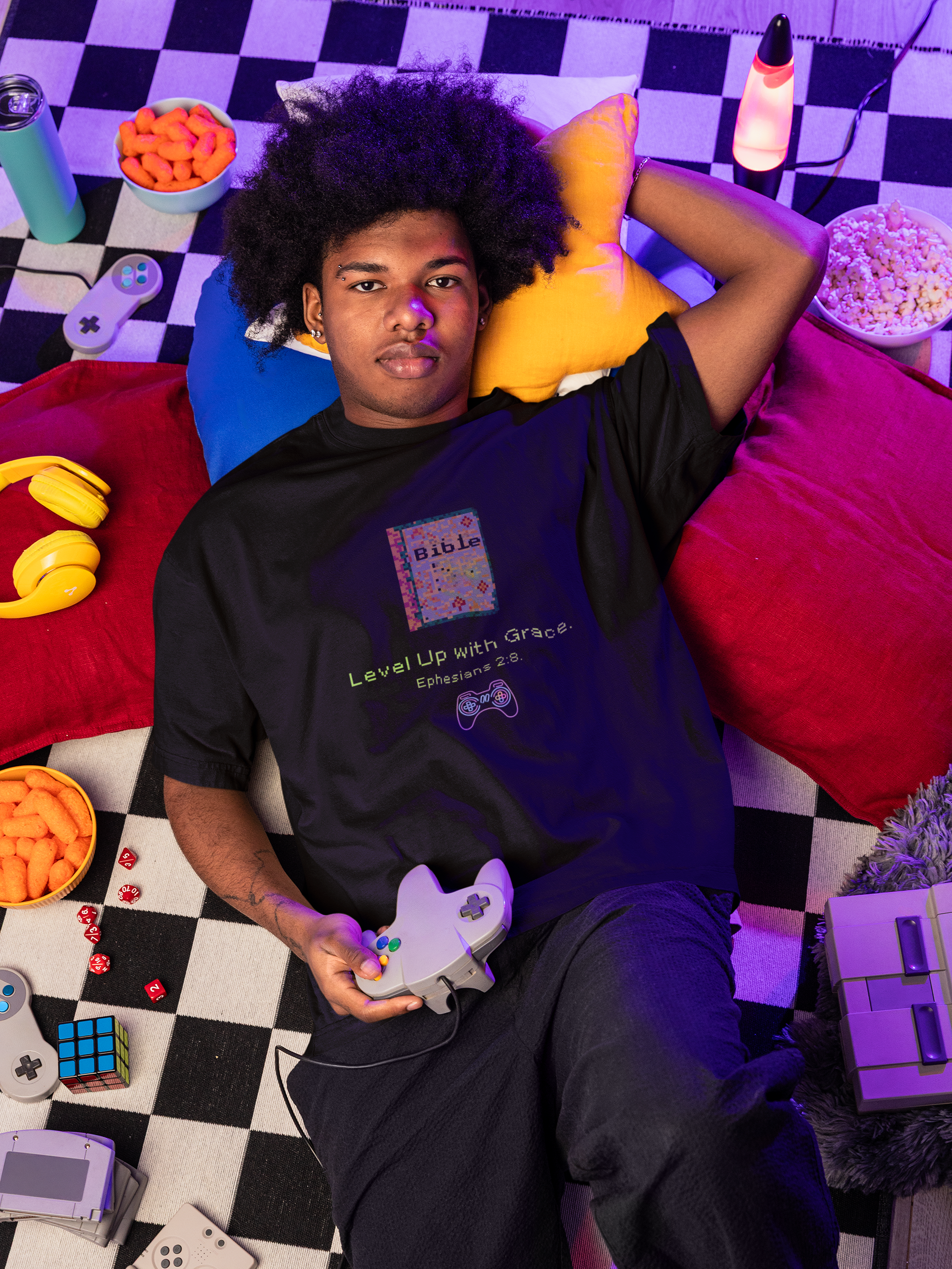 Celebrate spiritual growth with a playful twist in this faith-forward gamer tee. Featuring a pixelated Bible and video game controller, this shirt blends scripture and gaming culture with the uplifting message: “Level Up with Grace.” Inspired by Ephesians 2:8, it’s perfect for believers who love both grace and gameplay.