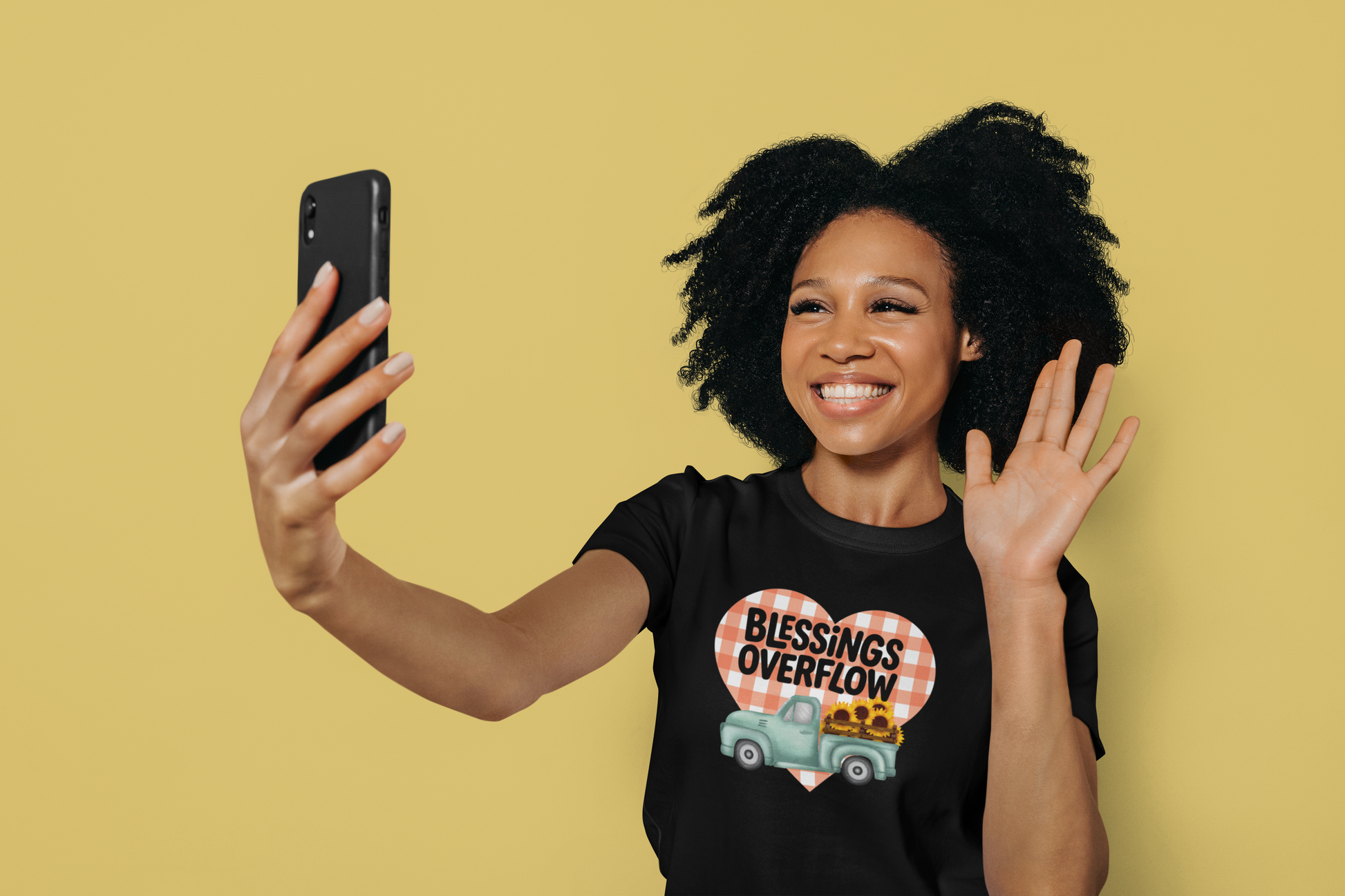 Introducing a charming Unisex Jersey Short Sleeve Tee, perfect for anyone looking to spread joy and positivity. This tee features an uplifting "Blessings Overflow" design, set against a heartwarming background, making it an ideal choice for casual outings, family gatherings, or cozy days at home. Its lightweight and breathable fabric ensures comfort whether you're running errands or enjoying a lazy afternoon. This versatile piece fits seamlessly into any wardrobe and is perfect for those who appreciate thoughtful, heartfelt designs. Great for gifting during holidays and celebrations such as Thanksgiving, family reunions, or simply as a reminder to cherish the good things in life!