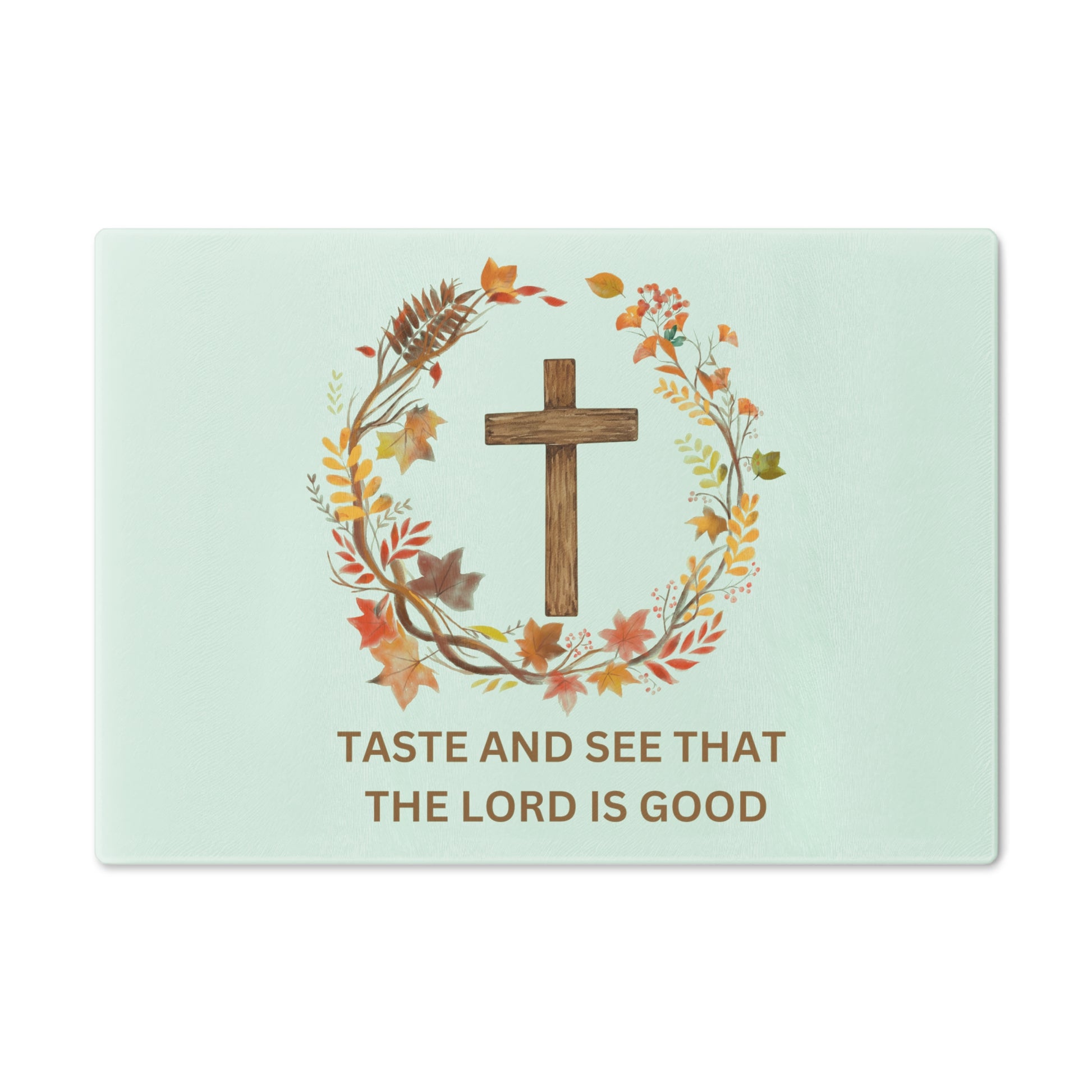 A serene, faith-inspired tempered glass cutting board that brings quiet beauty to everyday kitchen tasks. Soft mint background, a rustic wooden cross, and a delicate autumn wreath of leaves and sprigs frame the verse “Taste and see that the Lord is good,” creating a gentle reminder of gratitude while you cook. The smooth, nonporous surface is sanitary and easy to wipe clean; four rubber feet keep the board steady on counters. Subtle, watercolor-style colors let the design blend gracefully into farmhouse, cottage, or modern kitchens. Choose from two sizes to suit meal prep or charcuterie display — the lighter design elements will appear more translucent on the glass for an airy, watercolor effect.