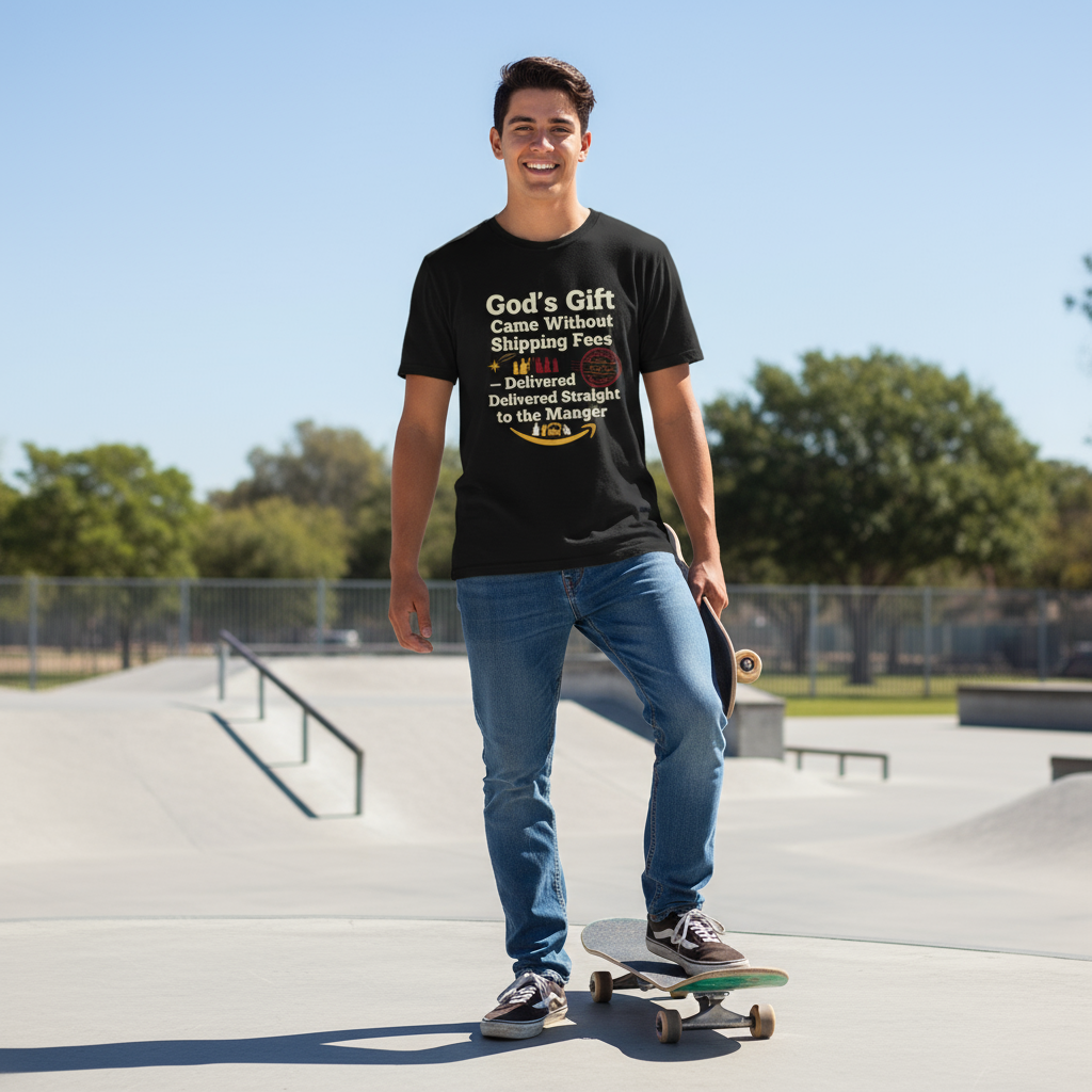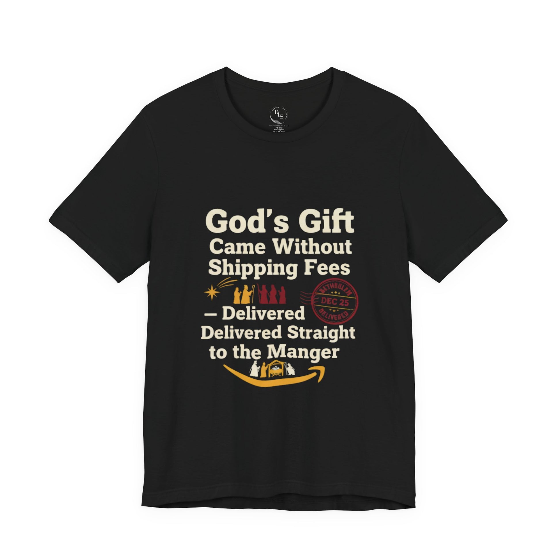 Christmas Tee — “God’s Gift Came Without Shipping Fees” Nativity Funny Religious Shirt