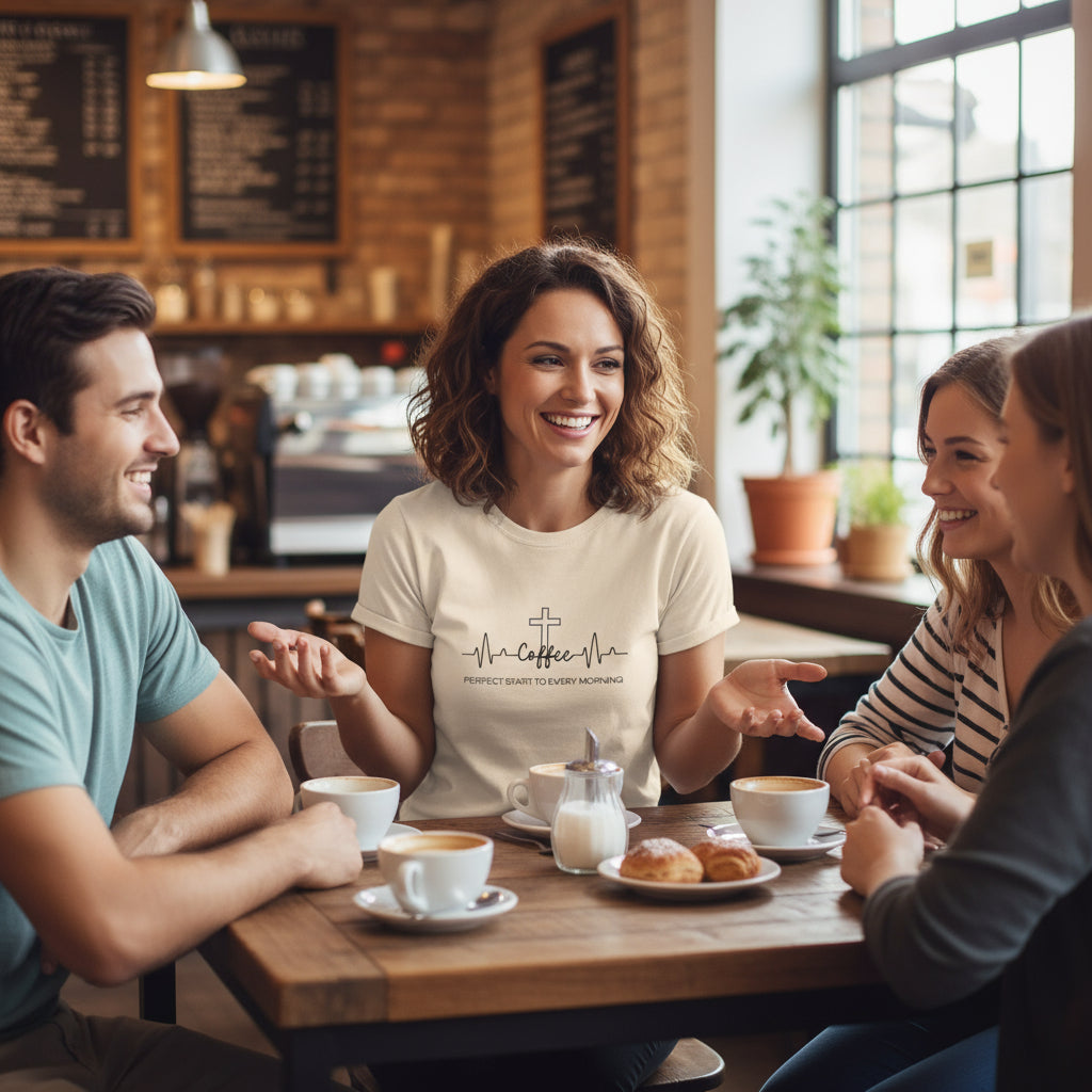 Coffee and Jesus are the perfect start to every morning.. Heartbeat Tee - Faith starts in the morning Perfect Start to Every Morning