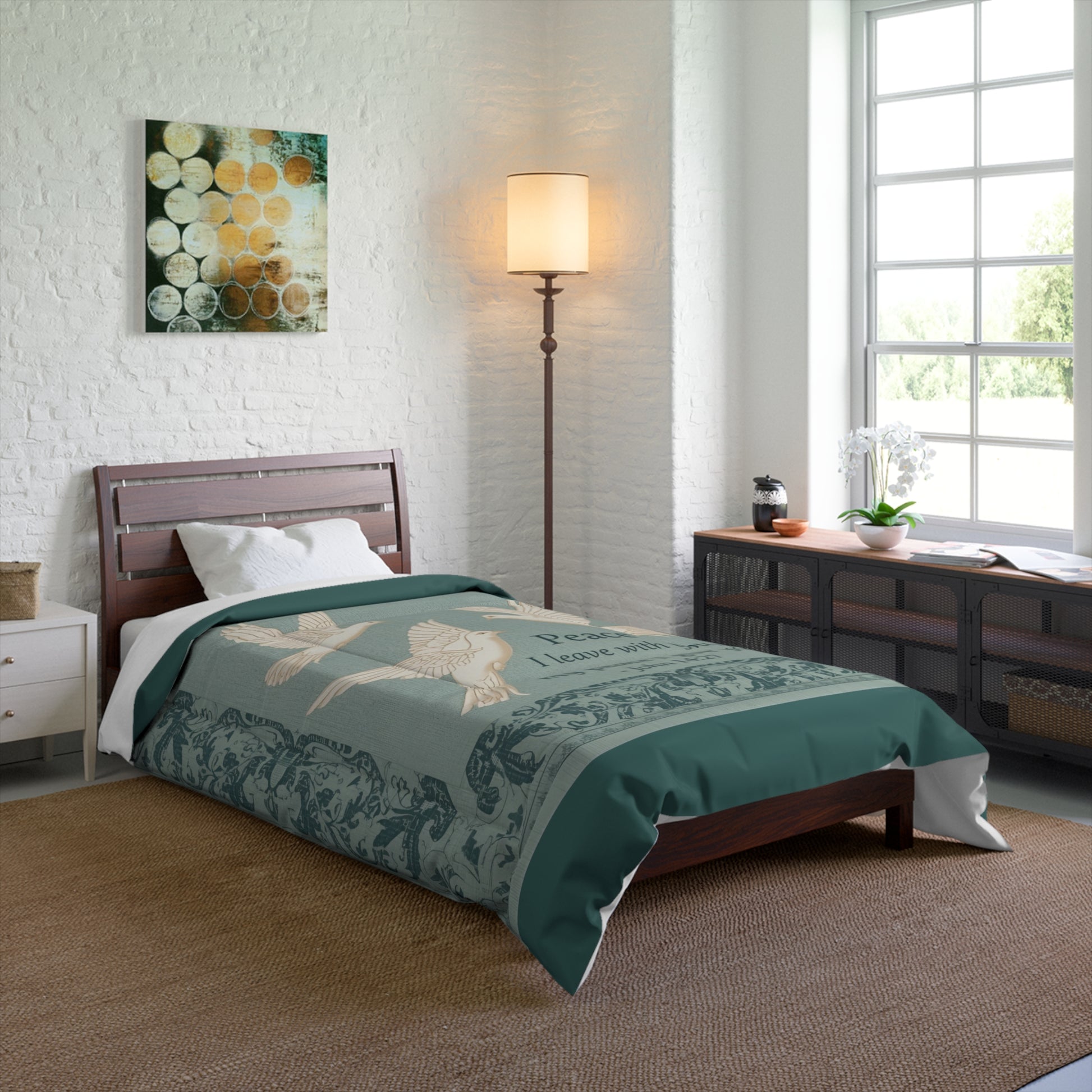 Wrap your bedroom in gentle calm with this lightweight comforter that whispers hope and stillness. Soft, delicate microfiber gives a smooth, cozy touch while the muted teal panel and vintage filigree frame draw the eye inward to three dove illustrations and the soothing verse, “Peace I leave with you, my peace I give you. John 14:27.” The one-sided, vibrant print keeps the artwork crisp and serene, and the subtle double square quilting holds the plush yet airy batting in place for a relaxed drape over your bed. It’s designed for quiet mornings, reflective evenings, and anyone who loves a restful, faith-forward aesthetic in their sanctuary.