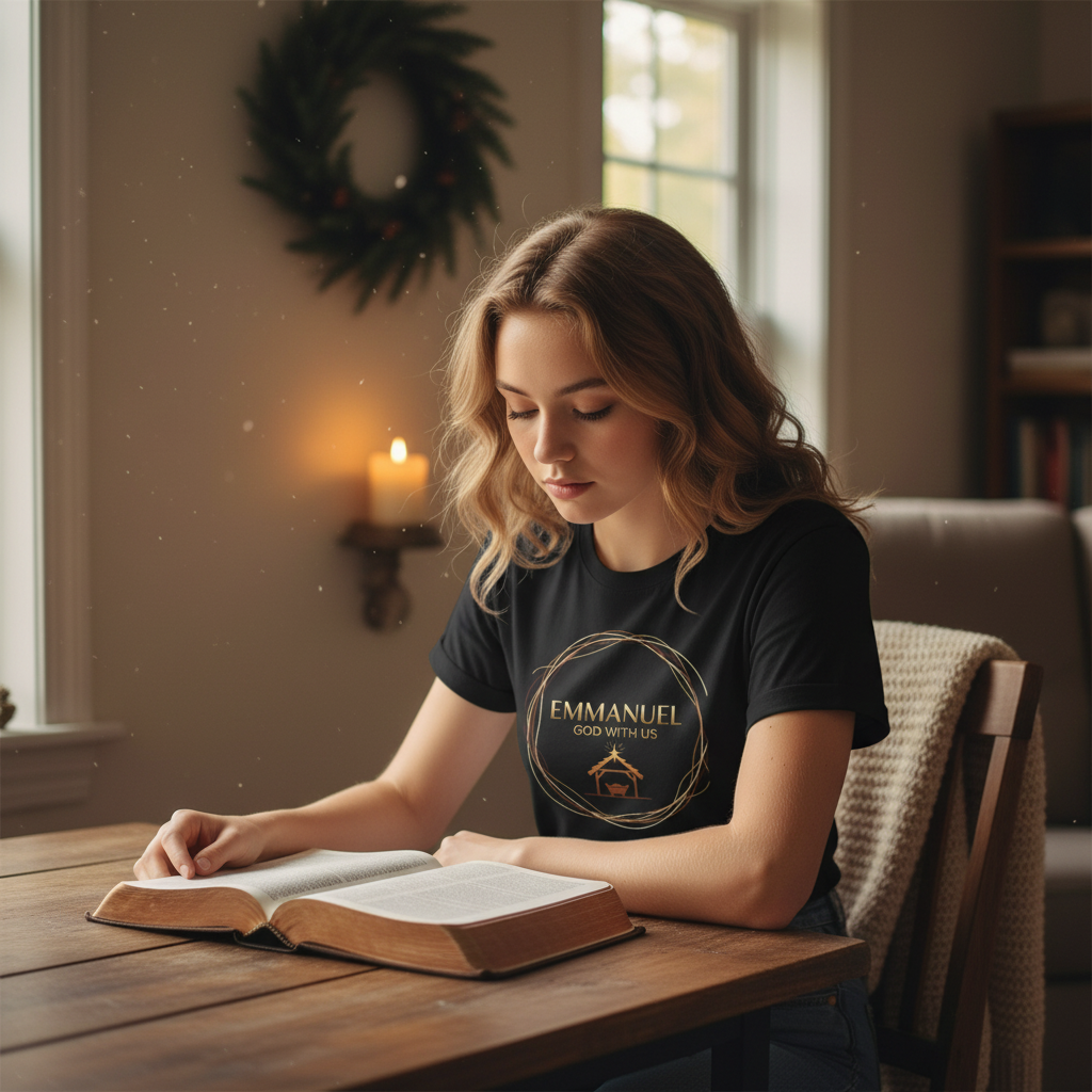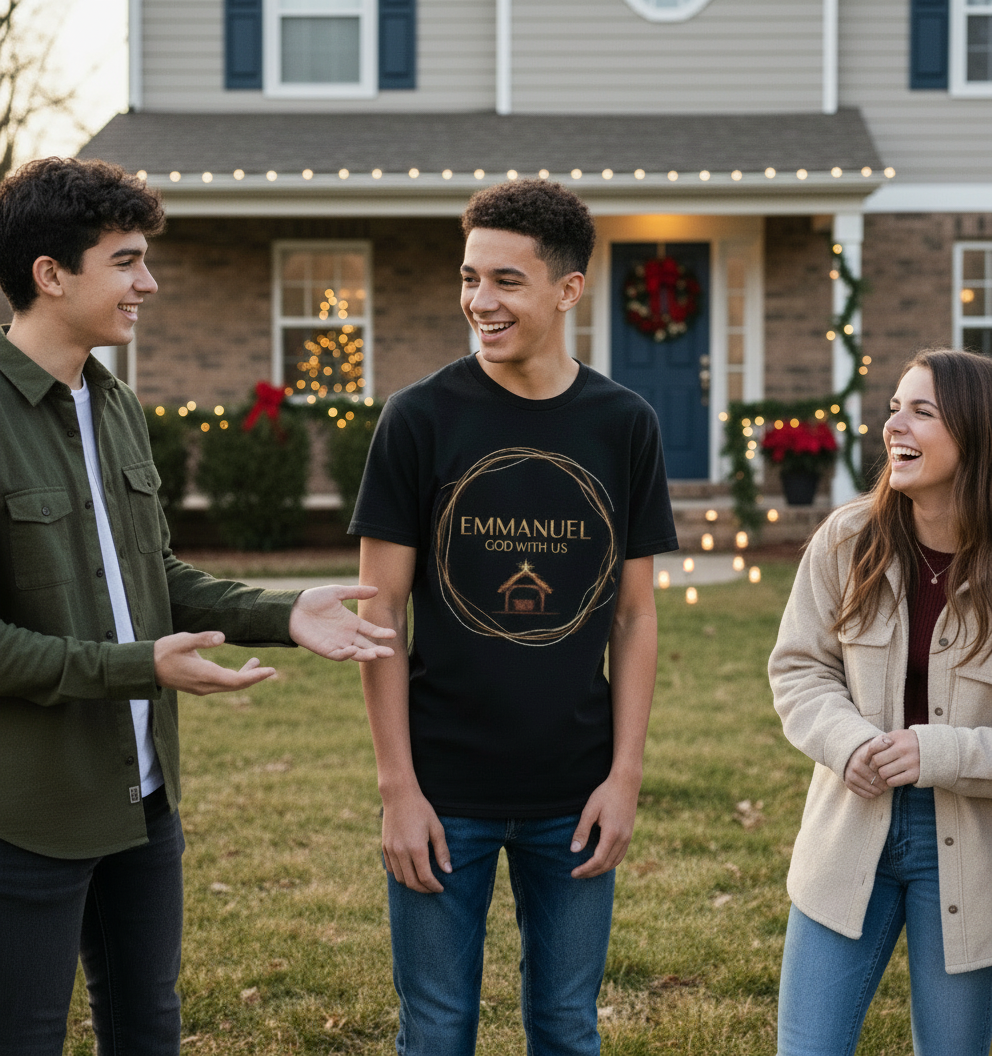 Soft, simple, and quietly reverent — this lightweight tee carries a gentle reminder: Emmanuel, God with us. The design centers a hand-drawn wreath in warm, earthy tones surrounding the word “EMMANUEL” with a tiny nativity hut beneath. On black cloth the artwork reads like candlelight — subdued, respectful, and suited to moments of reflection. Wear it to evening services, neighborhood caroling, or around the house while you slow down and remember why the season matters. The classic crew silhouette and fine ring-spun cotton give it a smooth, lived-in feel that layers easily under jackets or stands alone with jeans and boots.