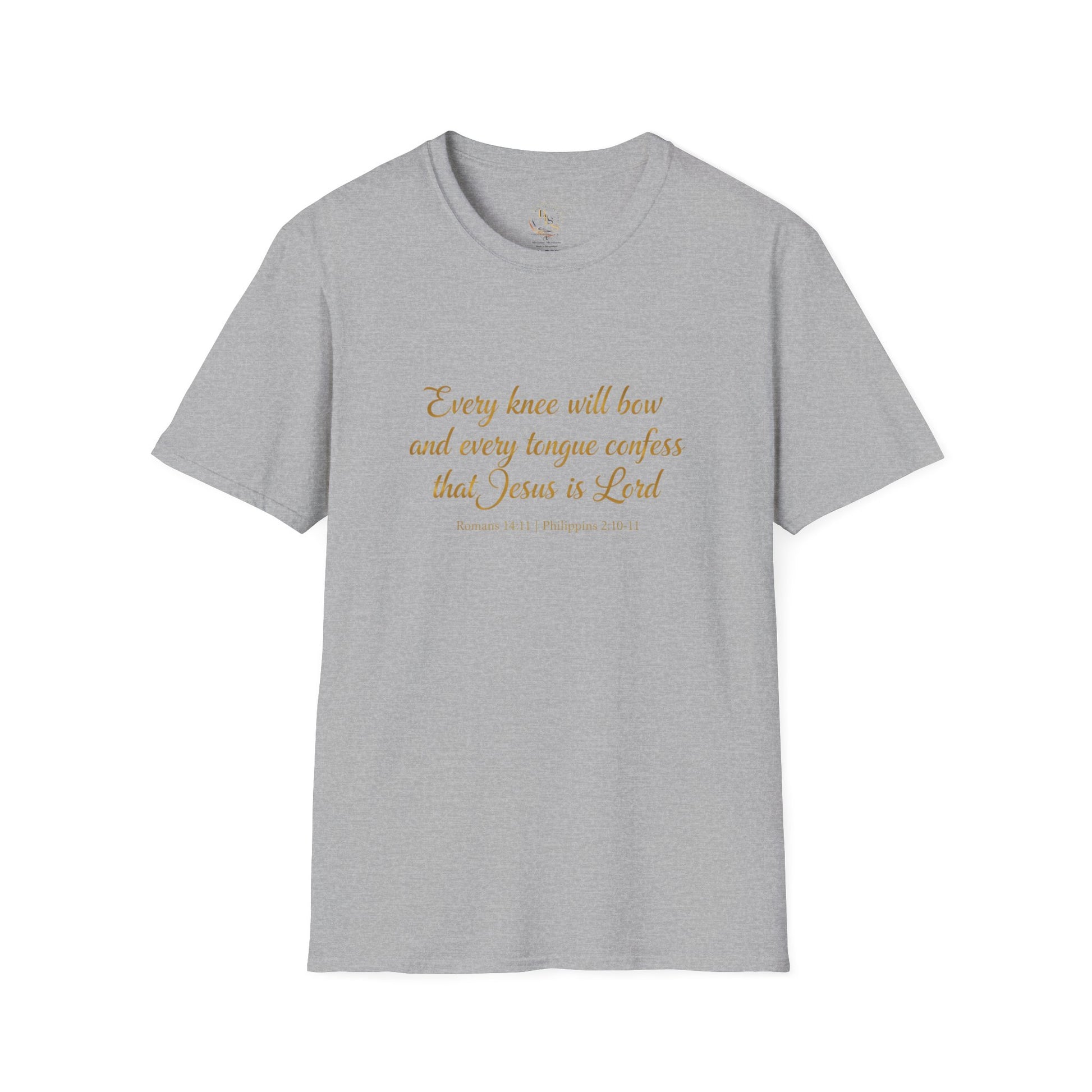 roclaim your faith boldly with this stunning t-shirt featuring one of Scripture's most powerful declarations: "Every knee will bow and every tongue confess that Jesus is Lord."