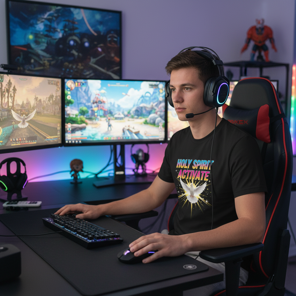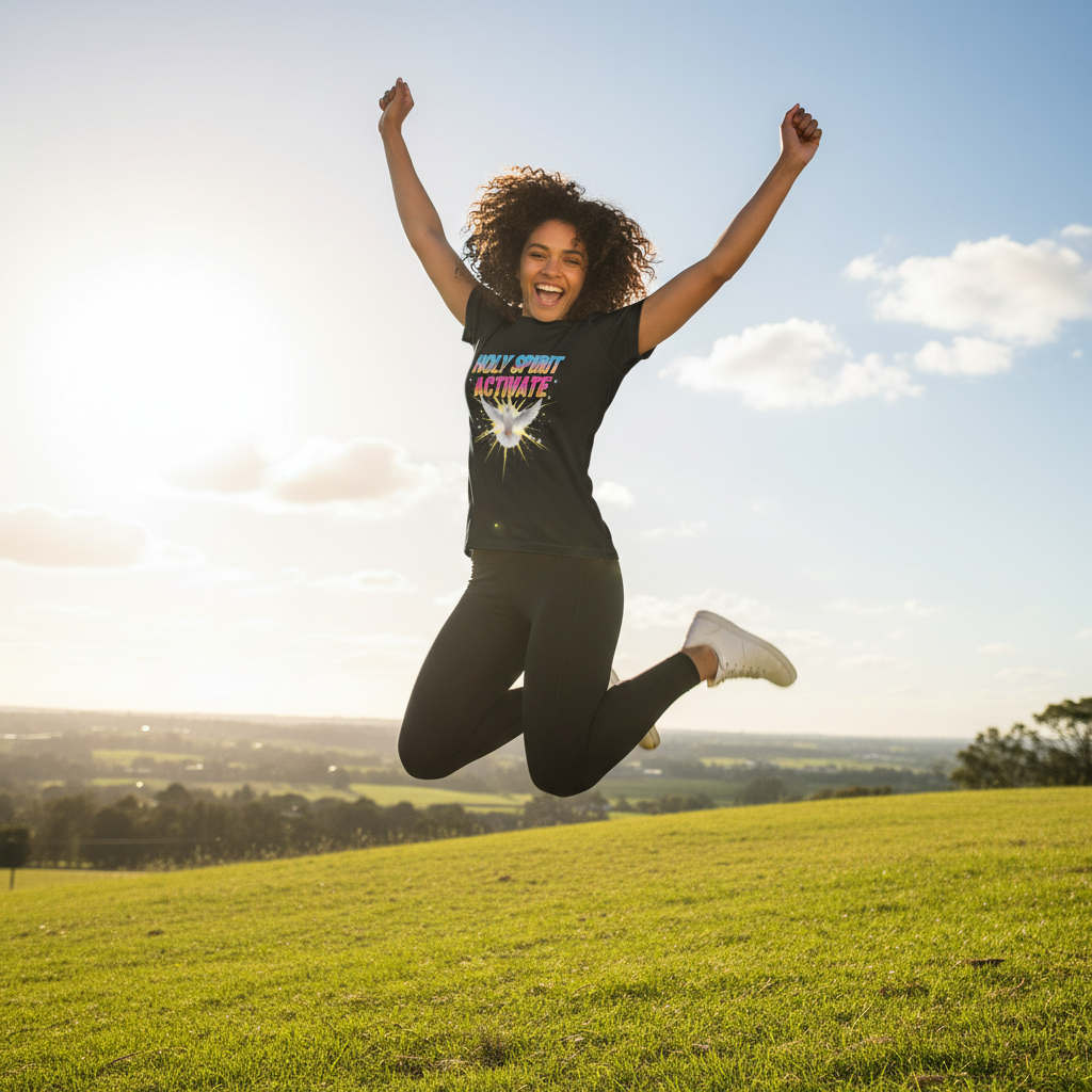 This lightweight crew-neck tee carries bold, uplifting energy. A radiant dove bursts from golden rays beneath retro, colorful lettering that reads “HOLY SPIRIT ACTIVATE,” mixing vintage pop-art vibes with a clear spiritual message. The soft, breathable cotton feels gentle on the skin while the structured retail fit keeps the silhouette neat—easy to layer under jackets or wear solo at church events, prayer nights, or faith-centered meetups. It’s made to move with you: shoulder tape and side seams keep the shape crisp, the ribbed collar holds form through washes, and a tear-away label reduces irritation. The graphic uses high-detail printing for bright, lasting color that stands out in a crowd without screaming for attention. Wear it when you want to speak your faith loudly and joyfully, during worship, outreach, or casual gatherings with your community.