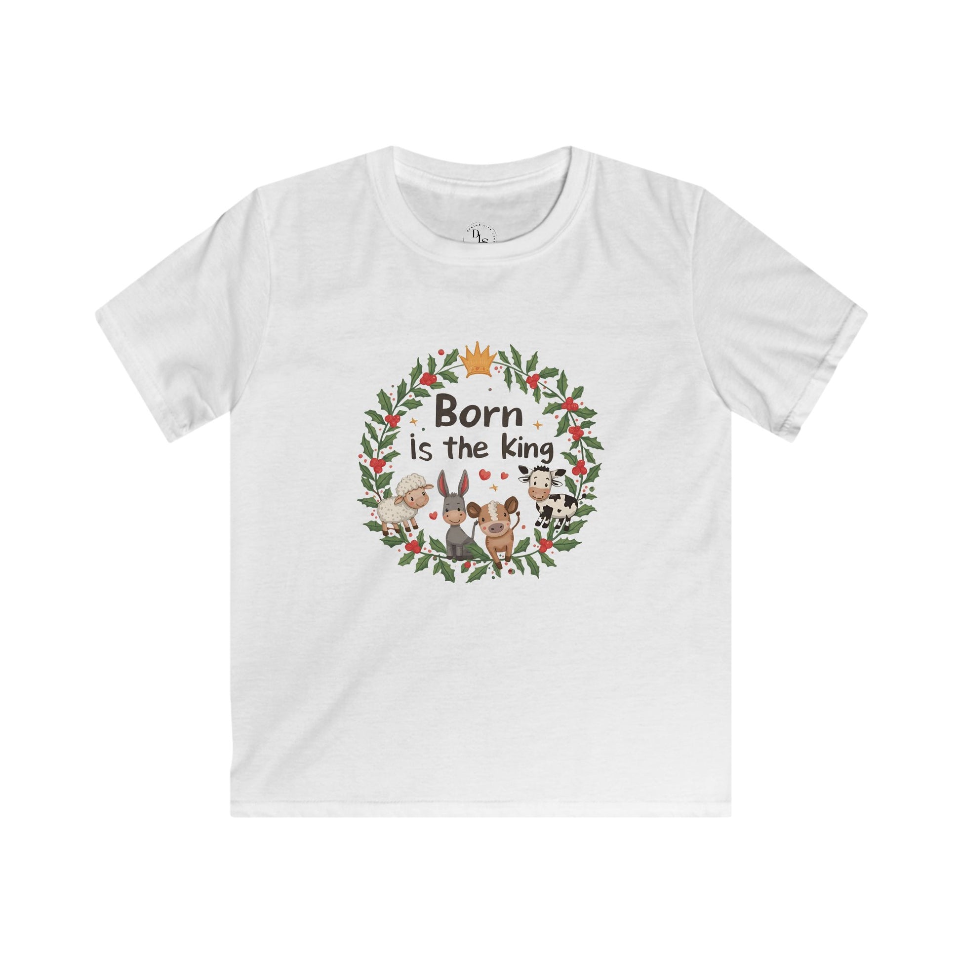 Soft, light, and gentle on little skin — this kids tee wraps holiday wonder into everyday play. A hand-drawn wreath of holly, tiny animals, and a small crown surrounds the phrase “Born is the king,” giving the shirt a quiet, storybook feel. It sits comfortably in a child’s wardrobe: breathable cotton, classic cut, and a tear-away label that keeps dressing fuss-free. Wear it to family gatherings, school nativity plays, or cozy mornings by the tree; it carries a calm, reverent charm without being flashy. The simple white canvas lets the illustration shine while staying easy to layer under sweaters or jackets when the weather turns crisp.