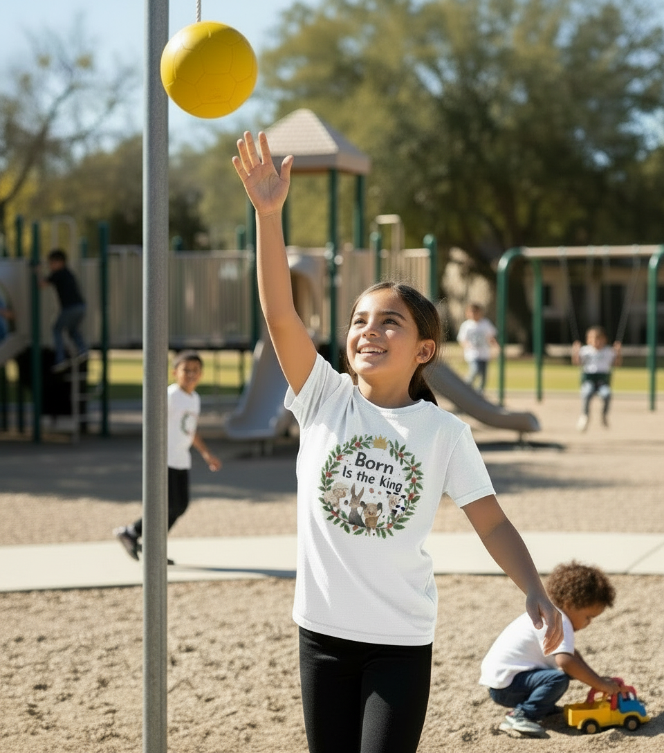 Kids Tee — "Born is the King" Nativity Wreath Christmas Shirt