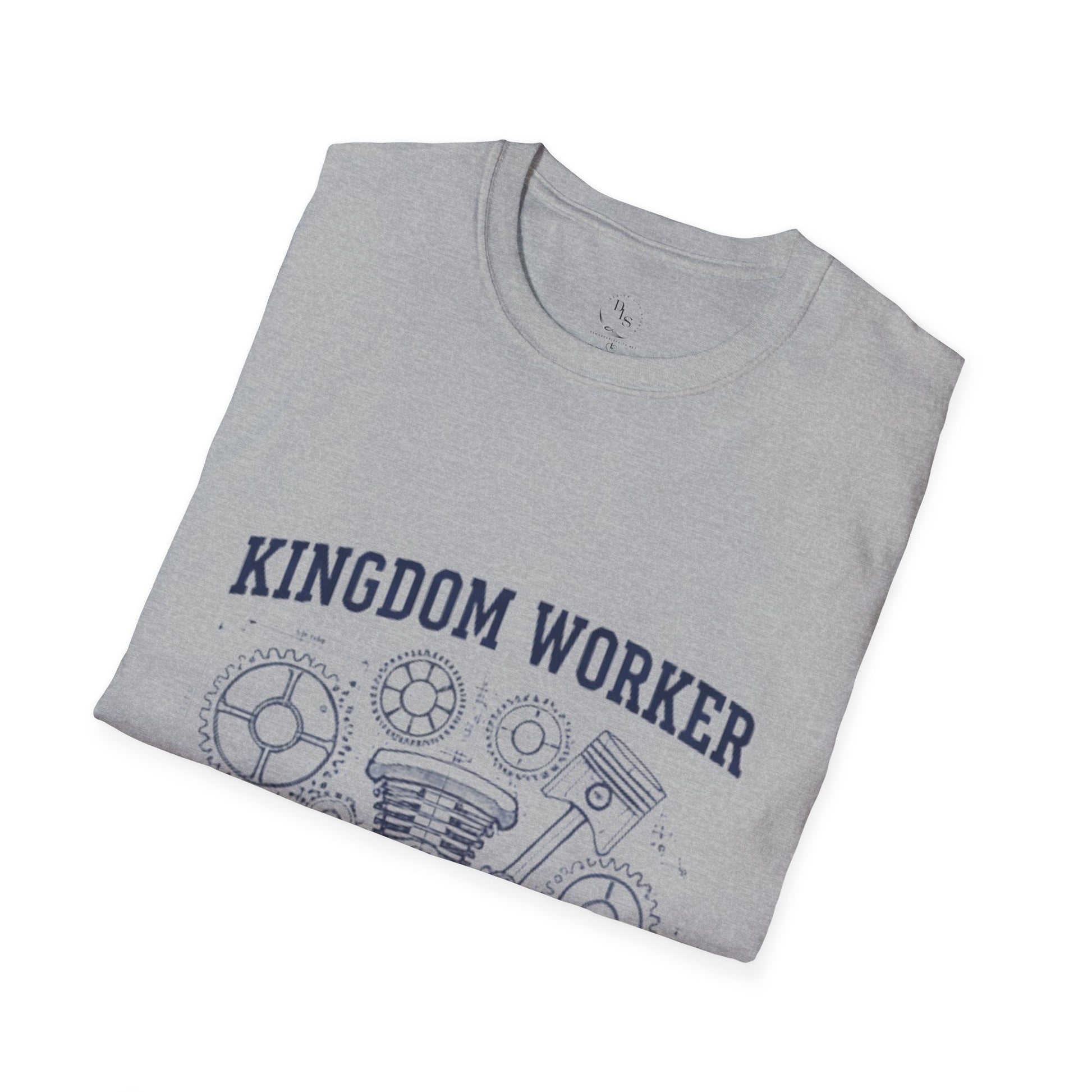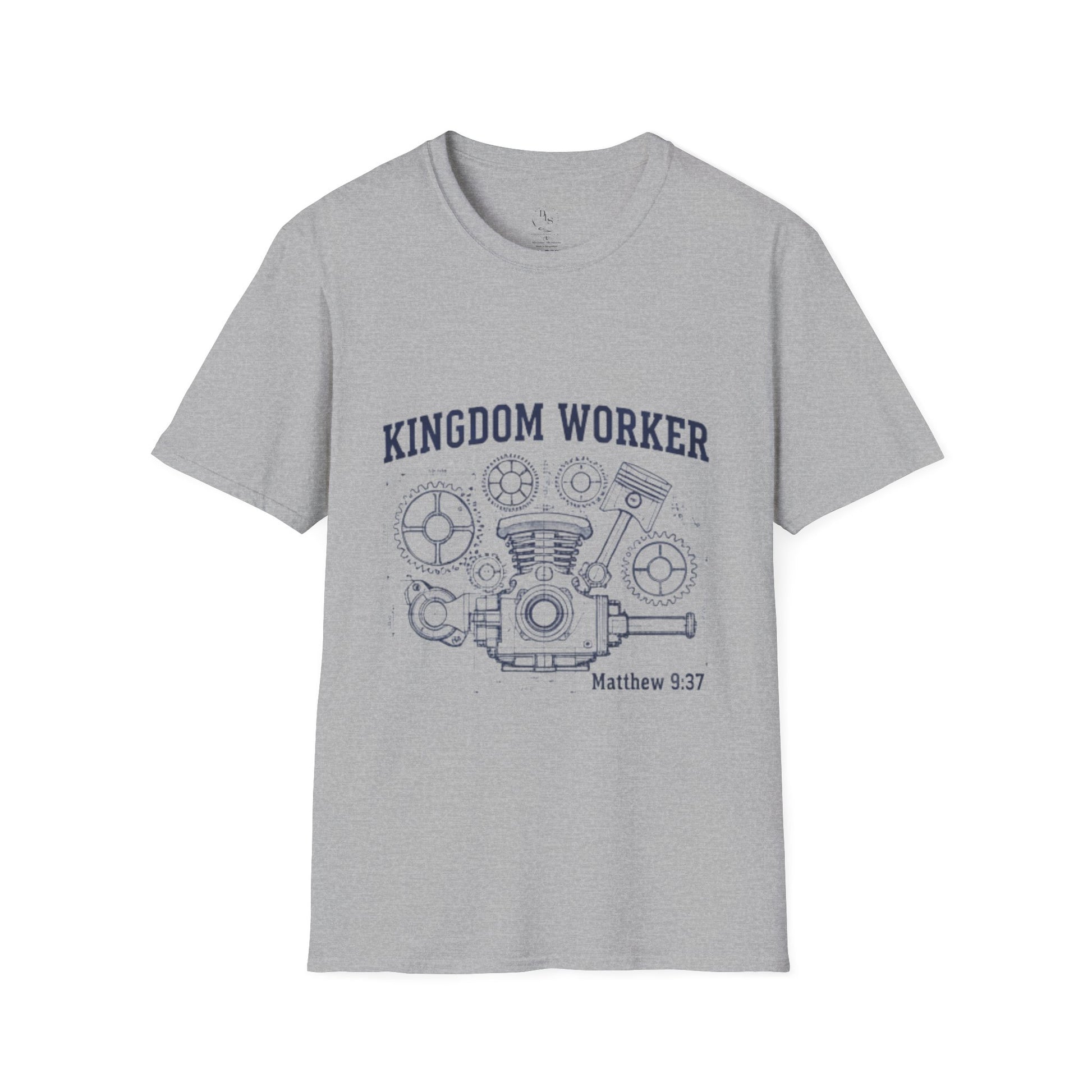 This lightweight cotton tee carries a quiet, hardworking message: ‘Kingdom Worker’ arches over a detailed engine-and-gear illustration with a subtle Matthew 9:37 reference. It reads like a badge for people who serve with callused hands and steady faith — pastors, mission teams, tradespeople, and anyone whose work is ministry in action. The clean, monochrome print keeps the look honest and wearable; the soft crew neck and classic fit make it easy to layer under a jacket or wear solo on long summer days. Wear it to volunteer days, church gatherings, mission trips, or out on the job to quietly declare where your strength and purpose come from.