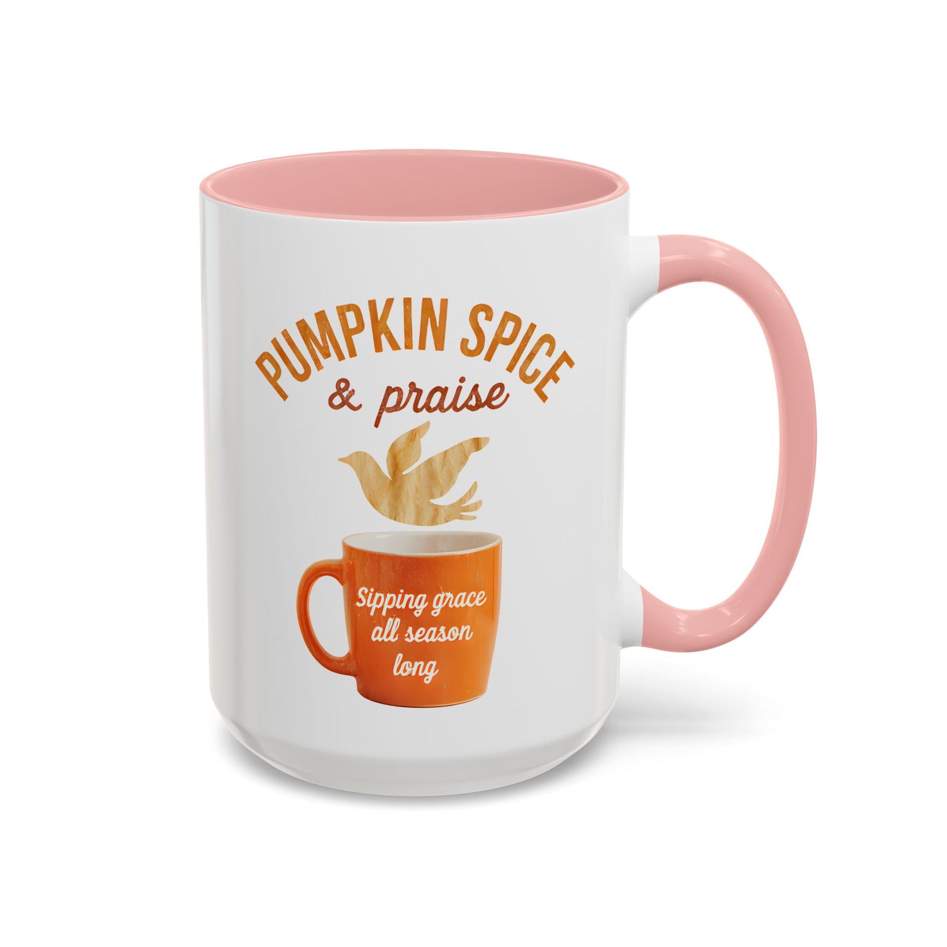 “Pumpkin Spice & Praise” fall comfort coffee cup. Give God all the praise well you enjoy your pumpkin spice.