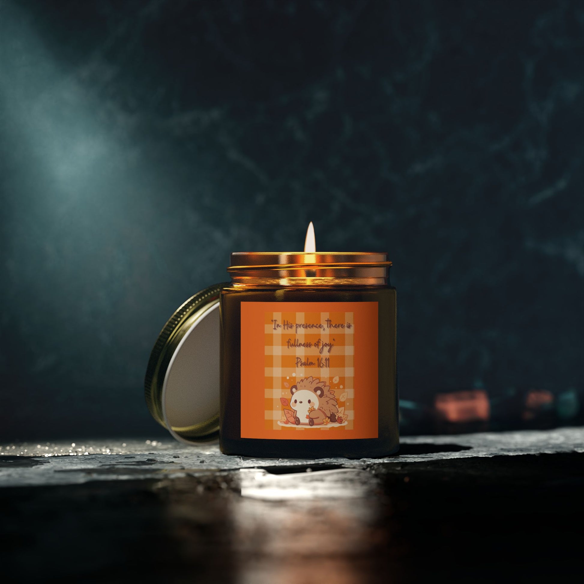 These scented candles are hand-poured in the USA, and made from premium coconut apricot wax with cotton wicks that are lead and zinc-free. With a burn time of approximately 20 hours, they provide long-lasting fragrance and warmth. The candles come in 9 scents, as well as in elegant. In His Presence Hedgehog Candle:** A whimsical reminder of the abundant joy found in God's presence. This adorable hedgehog, sculpted from [wax type - e.g., natural soy wax], holds a tiny flickering light, casting a warm and inviting glow. Let its gentle illumination fill your space with peace, comfort, and the quiet assurance of His love, bringing a fullness of joy to your heart