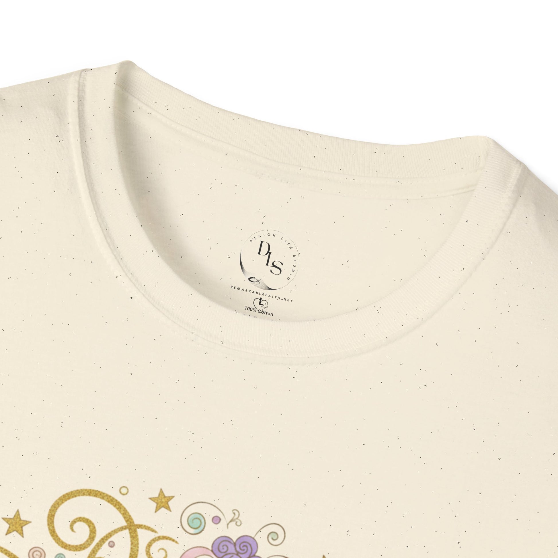 Lightweight, breathable, and thoughtfully detailed — this softstyle tee carries a gentle, faith-filled message framed in whimsical florals and gold swirls. Wear it to quiet mornings with a mug of coffee, to small-group gatherings, or while running weekday errands; the classic crew neck and relaxed fit drape easily over layers and let the artwork speak softly without shouting. Stitching and shoulder tape keep the shape through repeated wear, while the tear-away label and smooth ring-spun cotton make it comfortable enough to reach for again and again. The design’s muted pastels and subtle metallic accents create a calm, hopeful look that blends with denim, cardigans, or a favorite skirt.