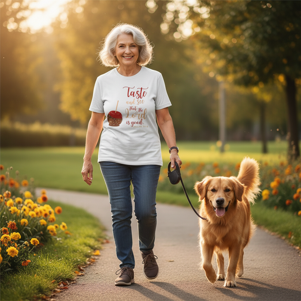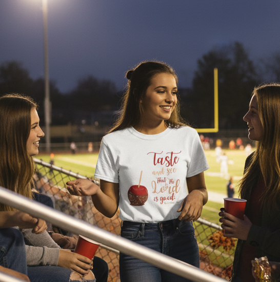 Celebrate God’s goodness with this cozy faith-based T-shirt featuring a candy apple and Psalms 34:8. Perfect for fall devotionals, church events, and legacy-inspired living.