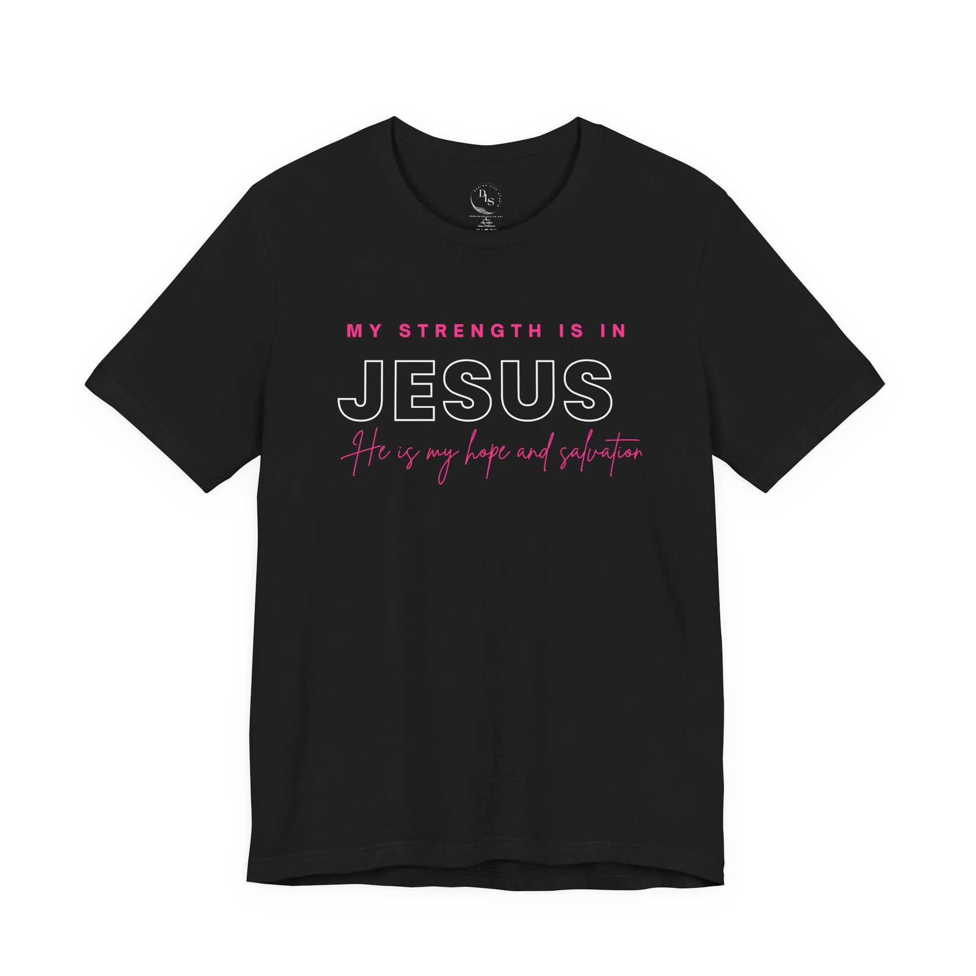 Express your faith boldly with the Unisex Jersey Short Sleeve Tee from Remarkable Faith. Featuring the powerful message "My strength is in Jesus - He is my Hope and Salvation," this short sleeve tee is a perfect way to showcase your devotion. Crafted for comfort and style, it’s ideal for everyday wear or your church gatherings. The design incorporates a meaningful "Perfect Love" cross motif, reminding you and others of the unwavering love and hope found in Christ. Embrace your faith with this inspiring and comfortable tee that speaks volumes without saying a word.