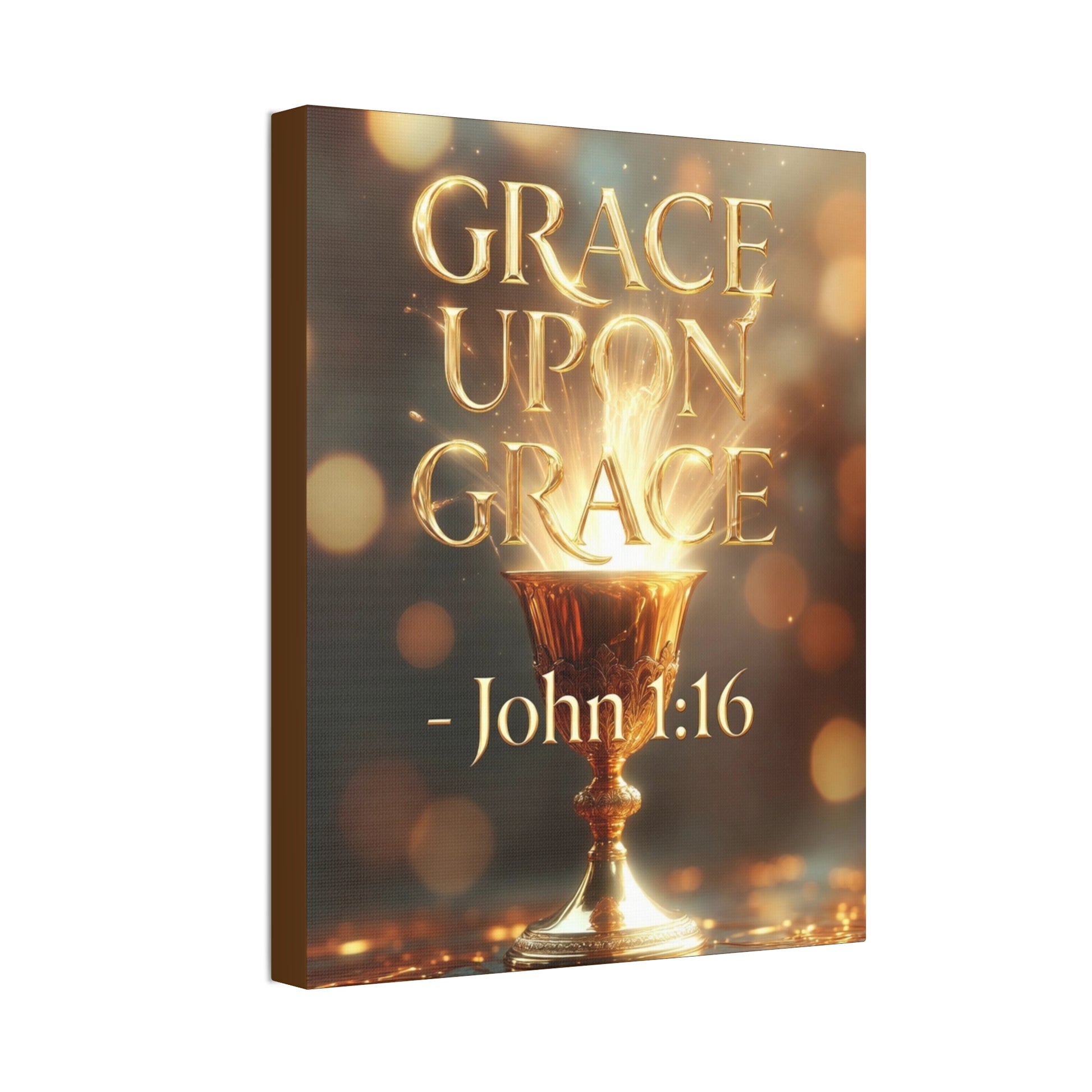 This stretched canvas brings a warm, reverent presence to any room. Golden light pours from a chalice and the words “Upon Grace – John 1:16” glow across a soft, bokeh background, creating a contemplative focal point that invites quiet reflection. The semi-gloss finish intensifies the luminous tones, while the hand-stretched fabric on a sturdy pine frame gives the piece an artisanal feel. Ready to hang with included hardware, it quietly anchors living rooms, entryways, or prayer corners with a sense of calm and gratitude.